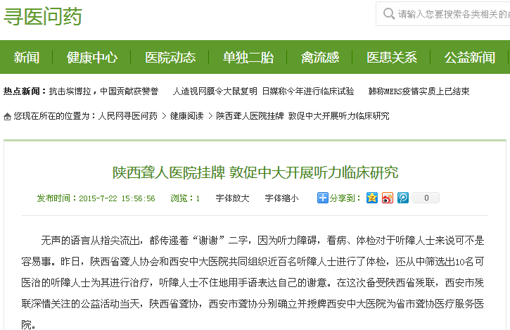 【人民网】陕西聋人定点医院挂牌 敦促中大开展听力临床研究